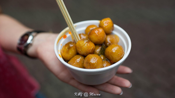咖喱鱼蛋,底层是白萝卜,上面是鱼蛋,鱼蛋个头不大,一口咬下很有韧劲,吃在嘴巴里QQ的弹,咖喱的味道配上辣酱,越吃越辣,好爽;如果怕辣可以告诉店家不要辣噢!