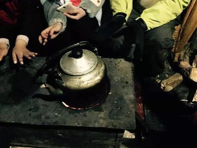 我们住的地方,可以说是客栈,但实际上就是个板房结合各种布和草的简易帐篷,几乎整个山顶的配置都是如此,大家都是大通铺,少有两人的标间,十点左右就会断电,烧水只能靠柴火。尽管条件艰苦,但我们一群娱乐青年最后也找到了玩法,烧起了柴火玩儿喝起了歪嘴儿(一种白酒),最后搞得一屋子都乌烟瘴气。不过不得不佩服,早睡的老板竟然能够在如此呛鼻的柴烟下睡着觉打着鼾,老板娘竟然能够在老板的鼾声与柴烟熏鼻的情况下熟睡得那么安详...