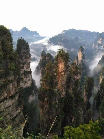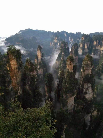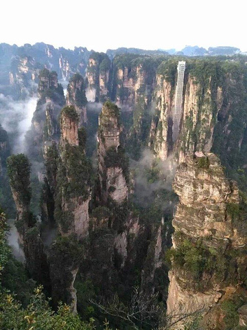 天门山索道为全世界最长的观光客运索道,从市区穿过。坐在轿箱里,看着窗外掠过的房屋、树木、山。此时,天开始阴沉起来,雾气又上升了,偶尔飘着几滴雨滴。到达索道终点,和妈妈商量了一下,不去天门寺,不走鬼斧栈道,就随便走走,看看山景,然后坐索道至中站,乘环保车路过99道湾,至天门洞。天还是阴沉沉的,仰头往天门洞方向看,云雾绕绕。上天门洞的台阶有999级,妈妈岁数大了,不能走那么长的台阶,所以放弃了,拍了照片后,坐环保车至索道中站下山。
