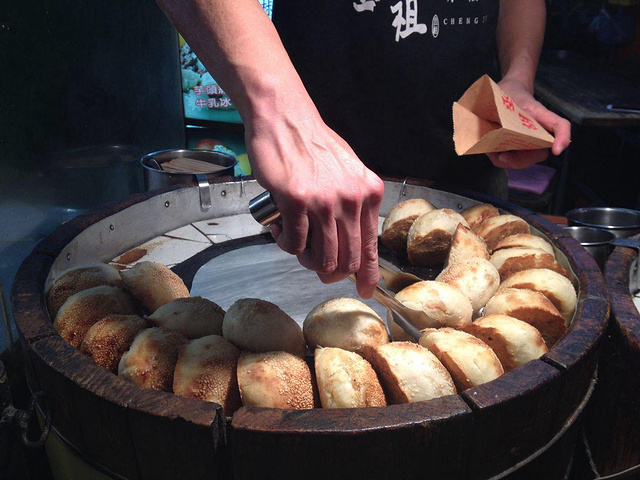 饶河夜市是我在台湾最喜欢的夜市之二了。这是台北最早的观光夜市了,吃的与其他夜市倒是差别不大,但绝对是我在台北夜市之旅中最惬意和浪漫的一回。逛完夜市拿着大包小包的美食,坐在饶河边,看着一排一排的夜灯,吹着凉风,真心觉得最快乐美好的生活不过如此。当然,饶河夜市也有它的杀手锏,那就是臭豆腐和胡椒饼。胡椒饼在入口处就可以看到,排着长长的队,远远的就能闻到浓郁的面香。而这里的臭豆腐也绝对是所有夜市中独一无二的。与我们尝吃的绍兴臭豆腐有点像,但独特就在于配料。浓浓的汤汁,以及入味的辣椒和酸菜,更突显了豆腐的鲜嫩,记得第一次去饶河,我就买了两份臭豆腐。