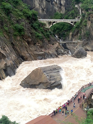 虎跳峡作为香格里拉经过的景点之一还是值得去一下的,从景区停车场下去虎跳峡再回到停车场参观时间一个多小时足够了,就是上下峡谷中楼梯较陡。虎跳峡的水很猛,很澎湃,不断打击虎跳石,对岸就是玉龙雪山的背面。注意去香格里拉路上气温不断降低,而且天气多变,雨伞披肩是必备的,披肩穿脱方便嘛。