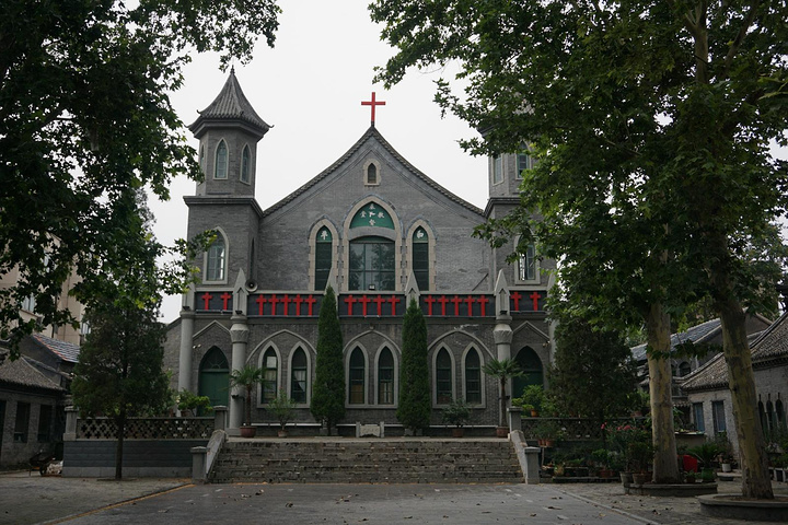主体建筑大门、二门、礼拜殿、望月楼(宣礼楼)排列在一条东西中轴线上,左右对称式排列,具有中国宫殿式建筑特征,同时还体现了阿拉伯建筑的艺术特色。院内古柏银杏点缀,给人以幽深肃穆之感。