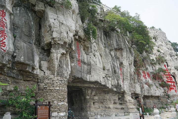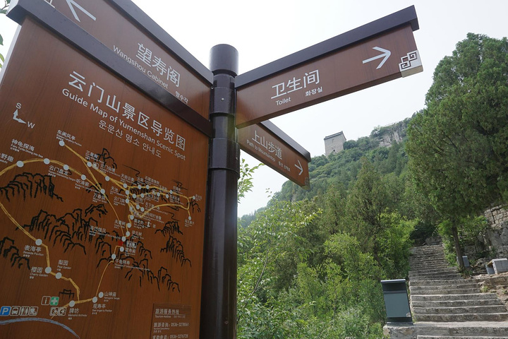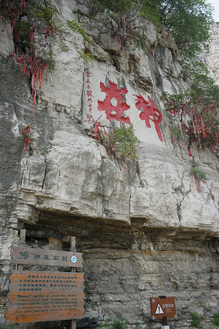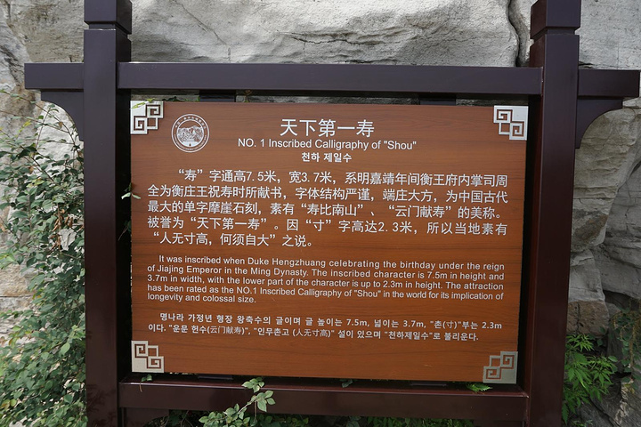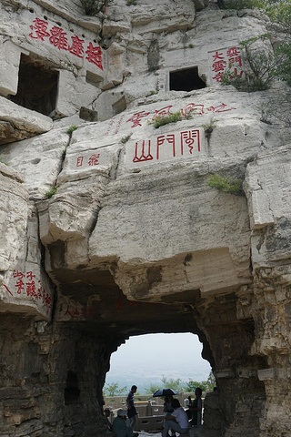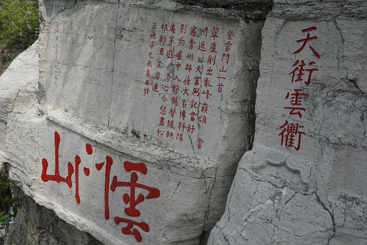 云门南北两侧的崖壁之上,多有历代文人墨客摩崖题诗刻字。云门山最著名的要算山顶北侧崖壁上这巨大的寿字,是明嘉靖时衡王府内掌司周全为衡王祝寿所书。它高7.5米,宽3.7米,仅寸字就高2.3米,高大男子亦不及,因此当地人有人无寸高的戏语。