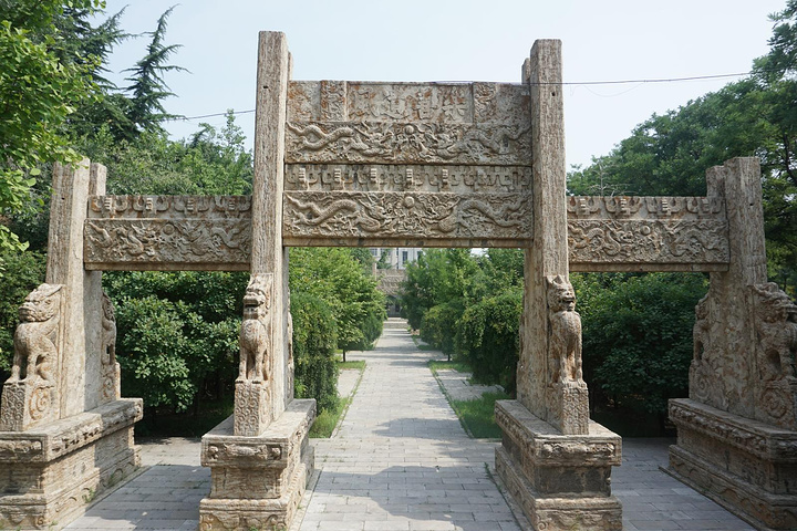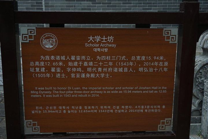 下火车车后,坐公交车半个小时就到了衡王府石坊。石坊是开放式景区,其实里面仅存石坊,别无他物。明朝青州城内的衡王府,在古典名著《红楼梦》、《聊斋志异》中都曾出现过他的鼎鼎大名。如今,这座规模宏大的建筑群早已荡然无存。只有从这仅剩的石坊上还依稀可以想见王府曾经的富丽堂皇。衡王佑楎,明宪宗第七子。成化二十三年(公元前487年)被册封为衡王。弘治十二年(公元1499),衡王就藩青州,大兴土木,建造了衡王府第。衡王共传了六世七王。
