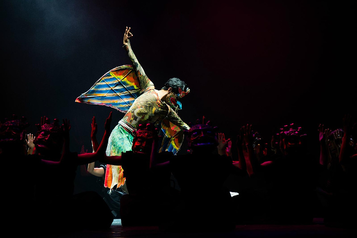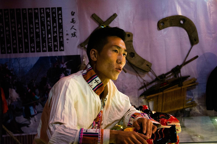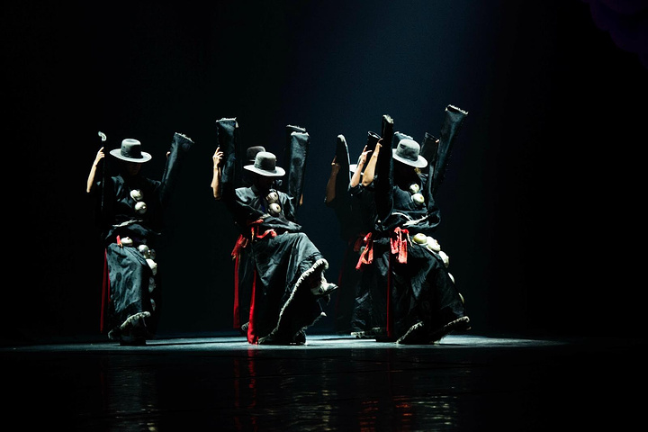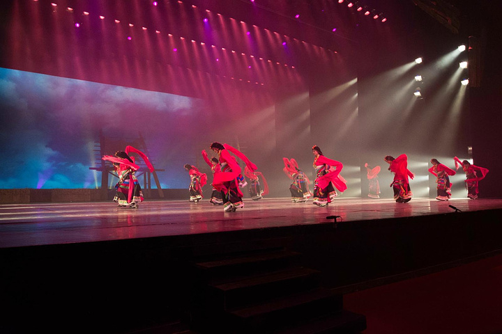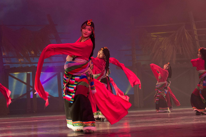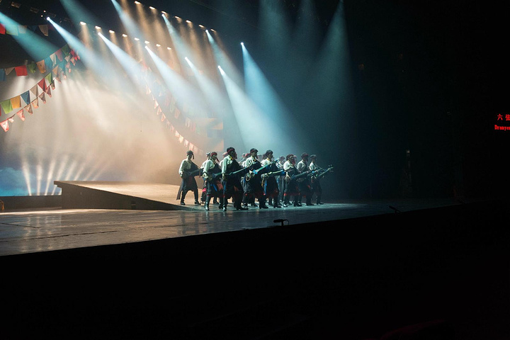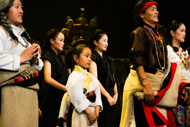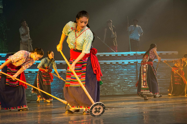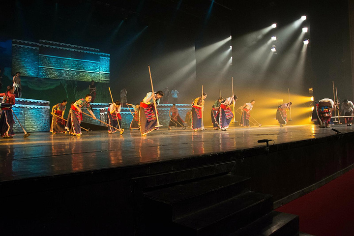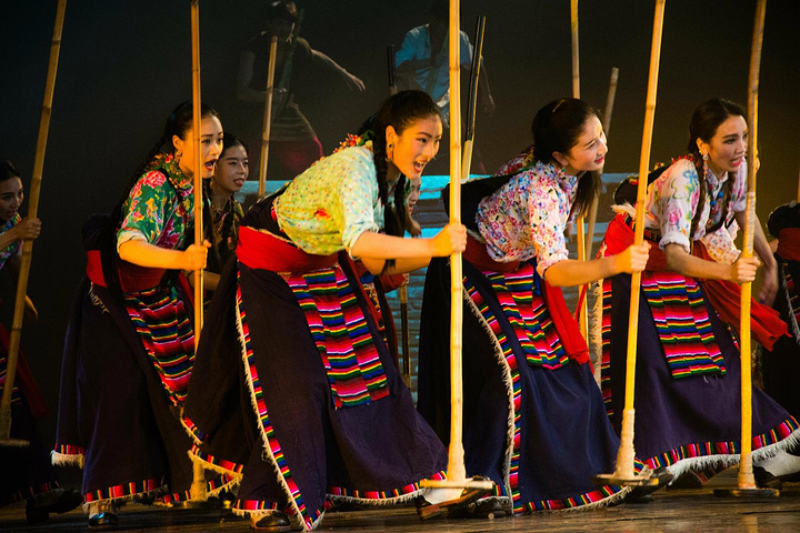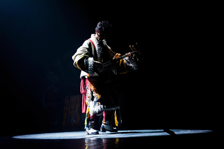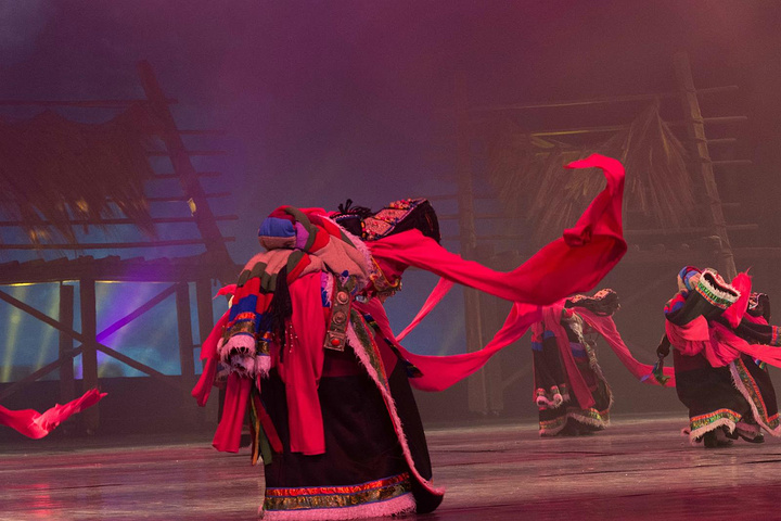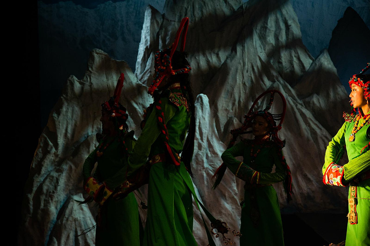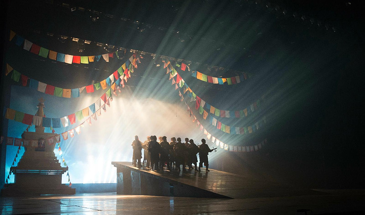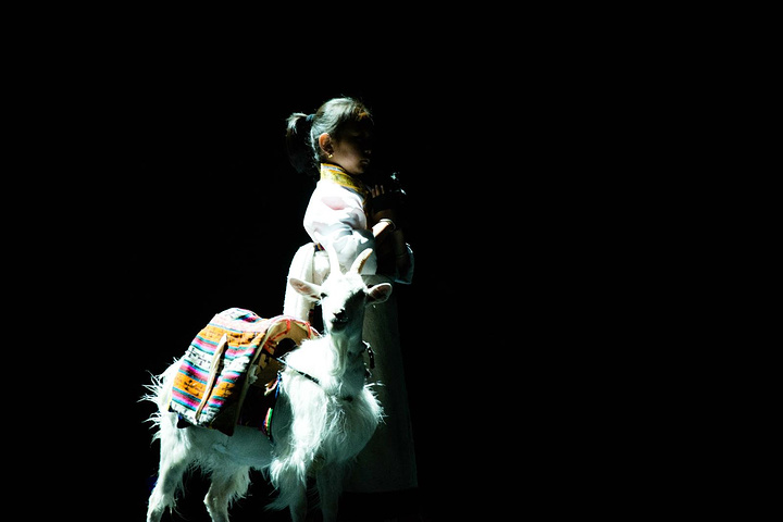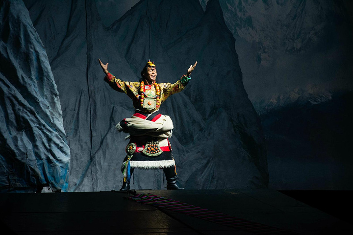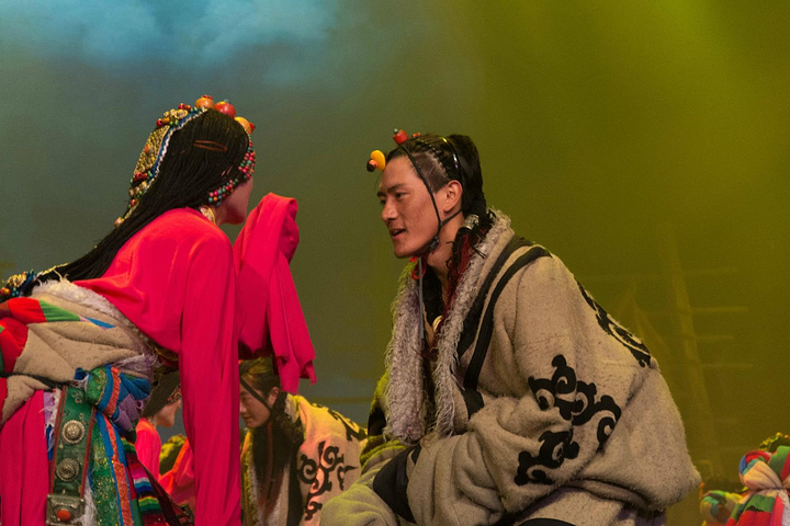 舞台中一顶巨大帐篷能看到九寨沟藏族女人忙碌的身影,一会打酥油茶、一会儿挤牛奶。帐篷外男人弹着六弦琴,深情地唱起情歌