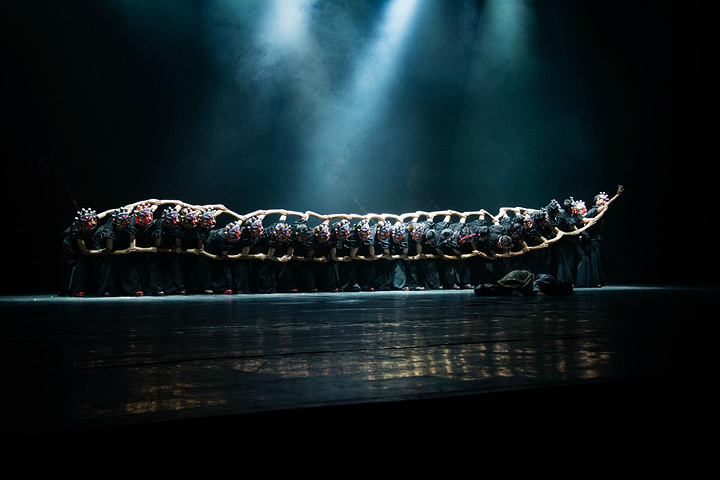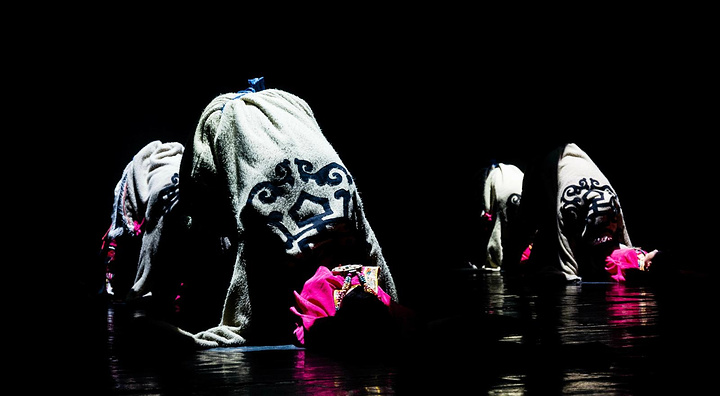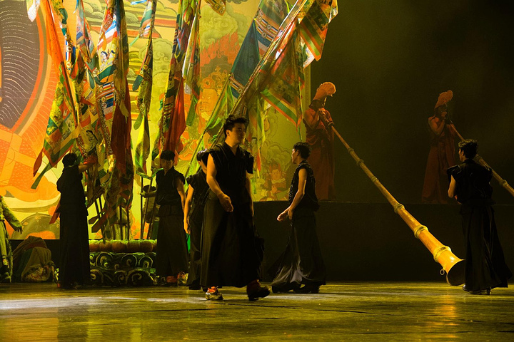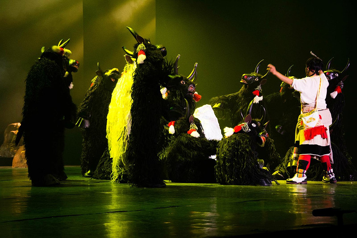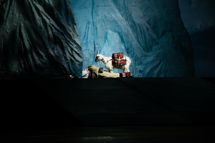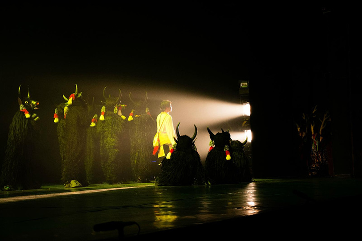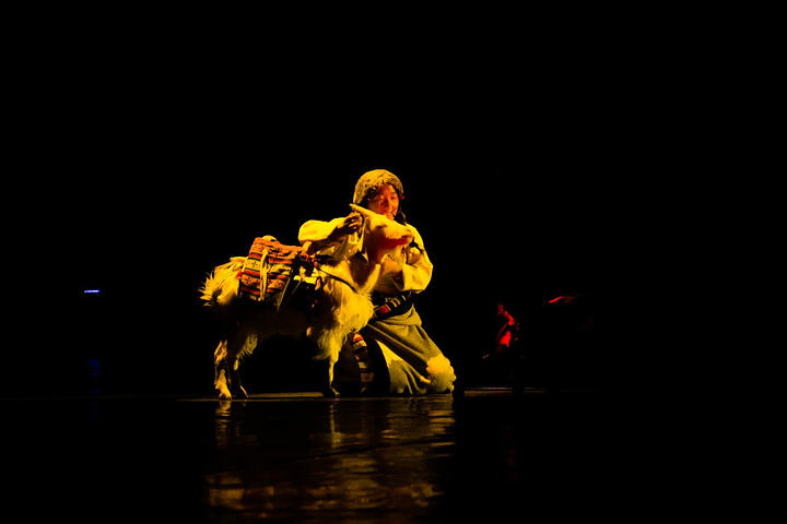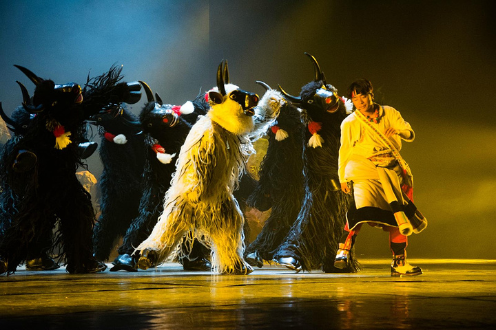 九寨沟放牛娃骑着牦牛出现在观众席中,焦急询问有没人看见丢失的牛群。这时,放牛娃发现了舞台上继续朝拜的老阿妈,他与老阿妈及大公牛产生了一段有趣的对话