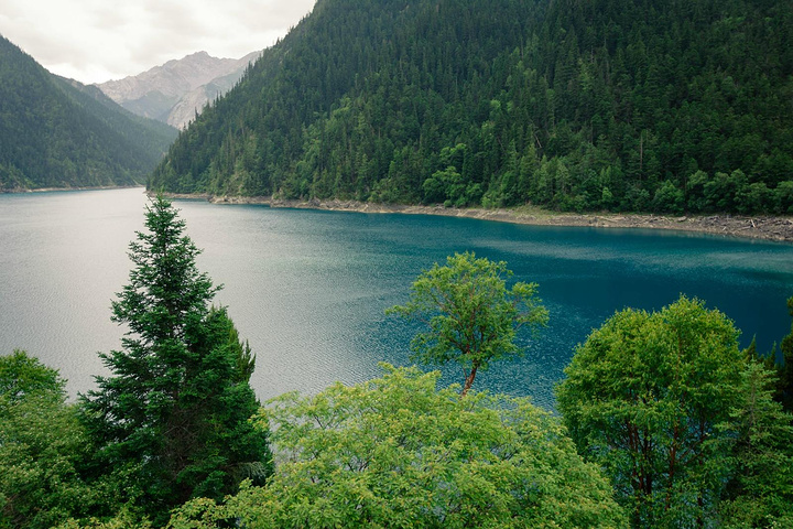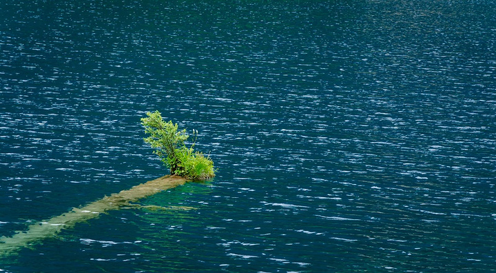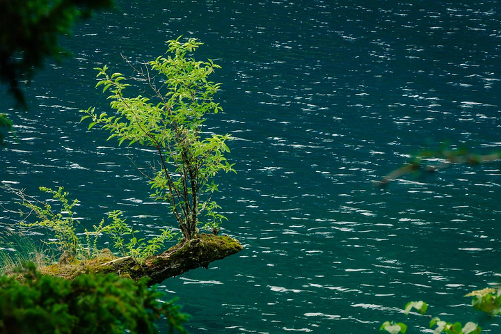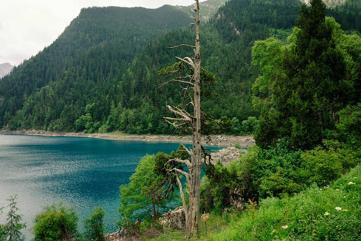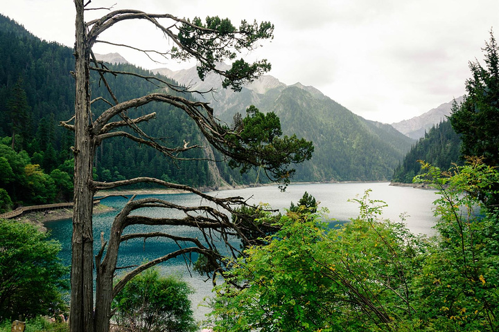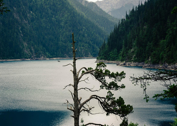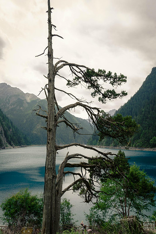 很快我们便坐车到达了长海,给人眼前一亮的并不是这个海子,而是这颗一半常青,一半光秃秃的树,,形成了九寨沟独一无二的美景,蓝色的海子,守护在这里的老树,