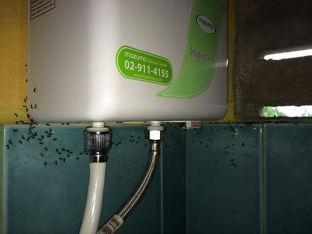 说实话,刚来到这里看完环境和居住条件,虽然卫生间都是现代化的,但因为诸多原因极大的不适应感。刚走进厕所的时候,很多蚂蚁,还不时会从天花板上掉到你身上,洗澡打开热水器,身后就几百只蚂蚁在那里爬(不是夸张)。