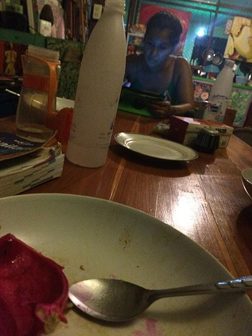 吃完饭Pui还给我们切了红心火龙果,自己家种的,然后就有了下面这张照片,我真的不记得当时拍了这么一张,看起来好惊悚的样子......肤色健康的Pui