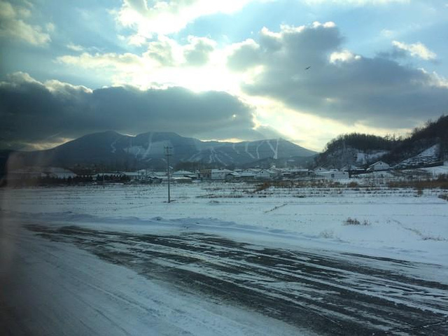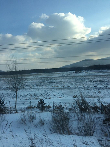 出了市区,到郊区的路上可以好好领略北国冬天的风光了。窗外的树上挂着厚厚的雪,一望无际的白茫茫的田野点缀几片被雪覆盖屋顶的农舍,远处延绵着缓和的山脉,已经可以满足一个南方人对大雪的视觉享受。