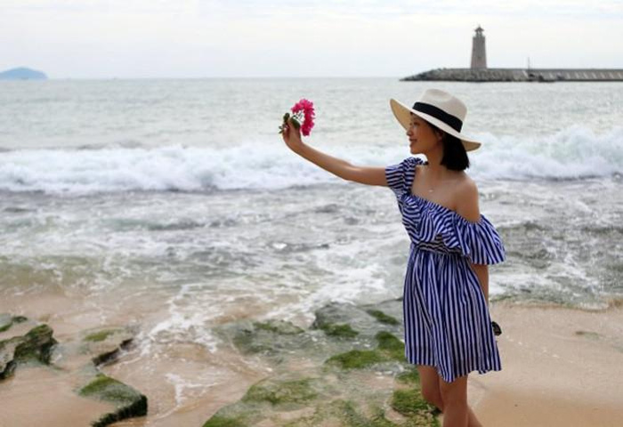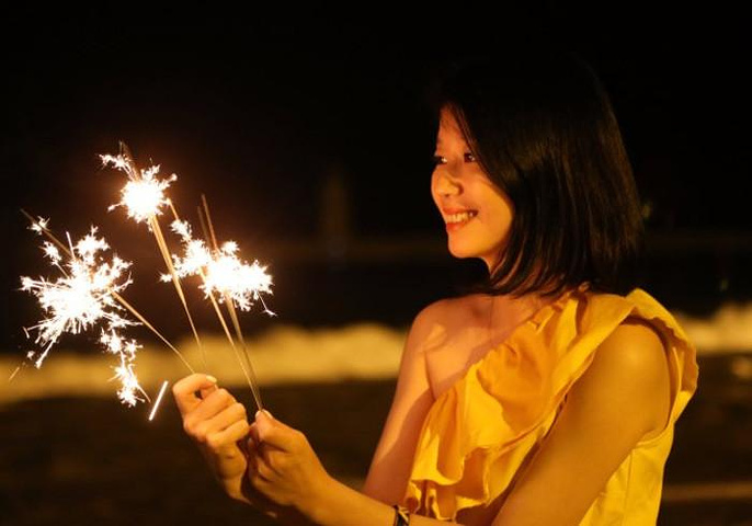 此刻,海浪如歌,烟花灿烂,它明黄色的光芒似乎与斜肩黄裙子相互交换着幸福密码,
