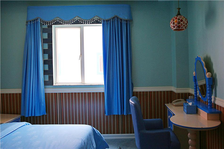 房型分为公主房和王子房,还有豪华套房。房间里用了粉红的主调色,芭比世界一般的梳妆台和床头柜,小公主们绝对会爱上这里!墙壁都是白雪公主图案,布满粉色的浪漫,面积还不小,大概四十多平米,配套1米8的双人床和1米2的宝宝床。浴室有宝宝浴缸真是一个大大的惊喜啊!
