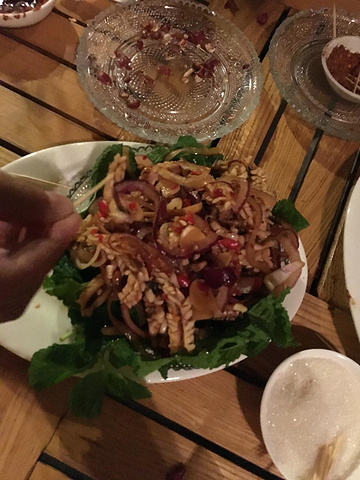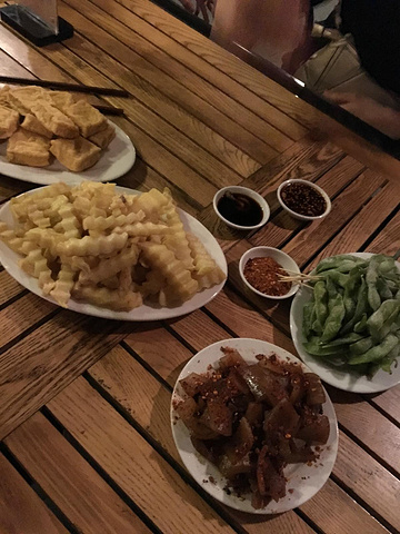 做完足疗我们就赶往这个地方--沙滩茶室,本来我们是想坐在外面的,那里有人在唱歌,歌声还很动听,但是人太多了,座位都满了,所以我们只能坐在里面了。不过还好,里面也很清凉,人精神了不少,大概一眼望过去来这里玩的外地人还是多的,很热闹。我们点了两份大份的扎啤,分别是葡萄味的和菠萝味的,还点了一份炸土豆、一份凉拌黄瓜、一份凉拌鱿鱼、一份烤猪皮、一份石屏豆腐、一份烤猪蹄、一份冰毛豆。点的时候没有发现多少,上来的时候感觉还是很多,但是女生嘛肯定是可以扫光的。这里的凉拌鱿鱼我很喜欢吃有点泰味的那种酸爽,辣椒也很给力,这酸爽,棒棒哒。喝着扎啤,吃着好吃的,聊聊这些年大家的变化,氛围很好。