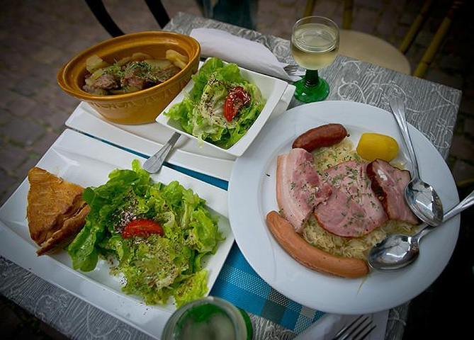 继续再点Baeckeoffe和Choucroute,里面夹着肉馅的面包、当地有名的白葡萄酒雷司令 Riesling。这家的Choucroute也很好吃