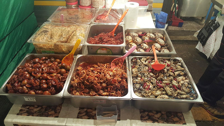 广藏市场地址:首尔特别市钟路区礼智洞6-1 (서울특별시 종로구 예지동 6-1)交通:地铁1号线钟路5街(Jongno5(o)-ga)站8号出口, 步行1分钟人均:35元支付:现金来自游记首尔5天4晚自由行——逛逛逛逛逛吃。。。