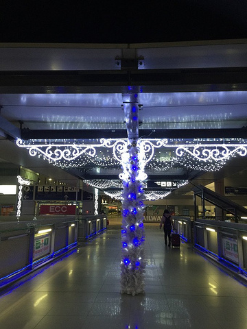 穿过圣诞节装扮的走廊,还有这个长的走廊,进入T1对面的楼。