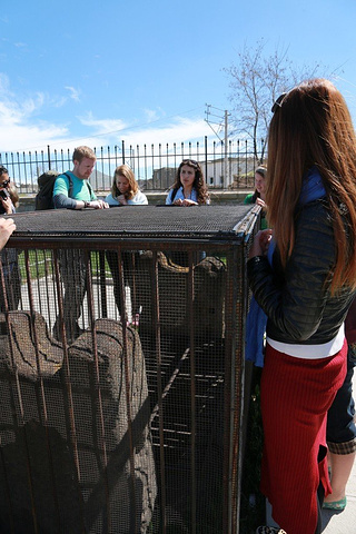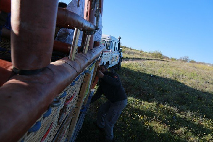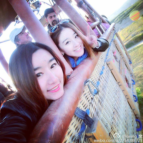 大概在天上起起落落的飘了一个小时,我们的吊篮安全的落地,马上有工作人员过来帮忙抬到车上把大家拉倒一个地势较为平坦的地方。正在和热气球篮子合影是一个工作人员跑过来给我耳朵上别了一朵小花,哈哈,好可爱。