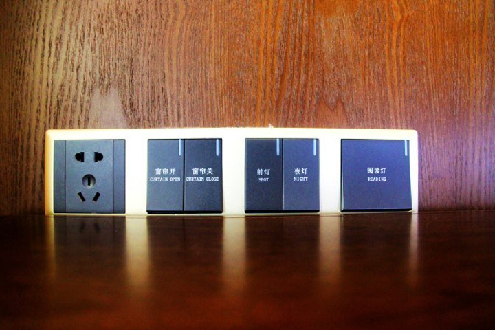 开关都集中在床头柜上,挺人性化的。窗帘是自动的,按开、关键即可。