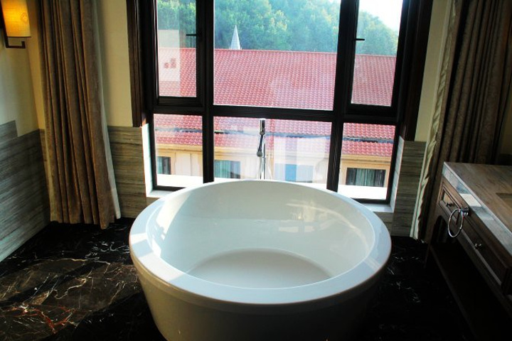 用房卡刷开房门,第一眼是阳台上高大宽敞的圆形浴缸,内心已经想扑过去了,可以边泡边欣赏窗外景致。