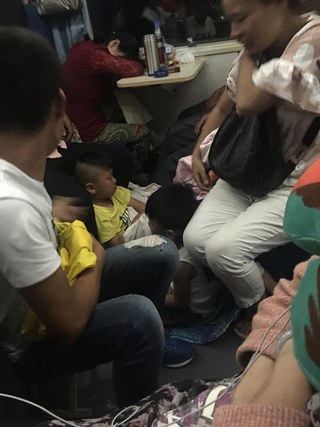 车厢里人挤人,两个人的座位可能坐着三个甚至四个人,座位下的大包小包堆得脚无处可放。不但如此,走道、吸烟室,黑压压的也到处是人,很多没买到坐票的人随身携带小马扎,见到空儿就坐下去,到了晚上小朋友都睡在座位底下 想要上厕所的话,来回一趟越过无数障碍起码得十分钟。喝水之前都要先考虑一会上次厕所要肿么挤过去😱😨