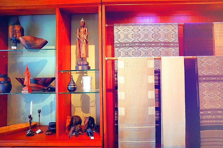 它们都是将老挝的传统风格与现代时尚的元素相结合,设计出来的独一无二的艺术品,按美学的细致标准,或装载在木柜中的每一方块柜格中,或摆放在长条桌上,或挂在衣架上,购物也成了提升审美情趣的一种方式。