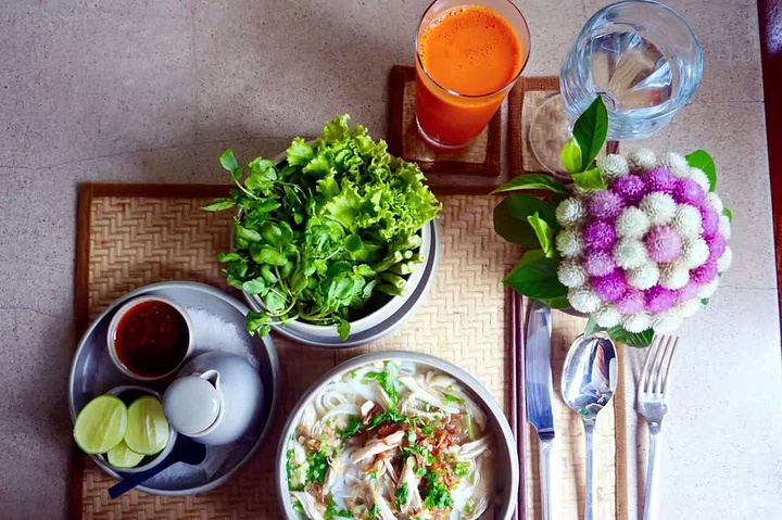 早晨,可以选择一份老挝特色的米粉打开一天味蕾,铺满了薄荷叶、豆芽、菜叶、鸡肉或猪肉切丝,若是想酸一些,可以挤一些柠檬汁,若是想辣一些,辣椒粉十足够劲。