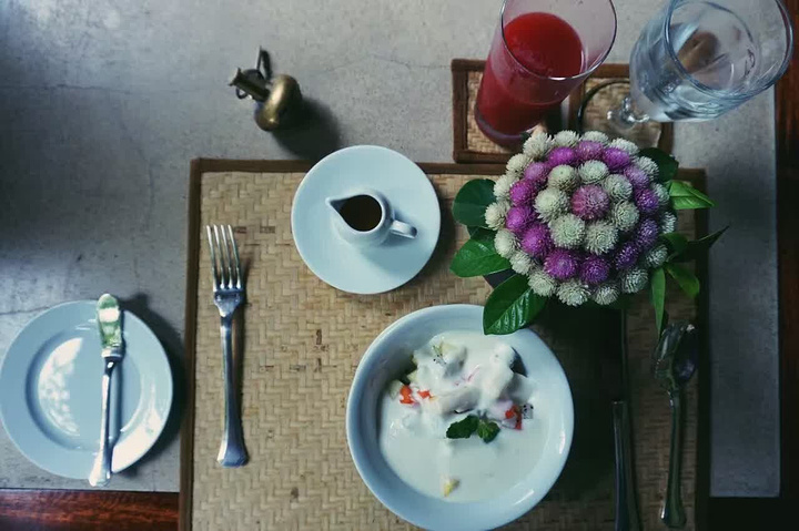 还可以点一份老挝传统特色的蛋饼,或新鲜水果mix优格的鲜果沙拉,配上一杯混喝果汁,别吃太多,属于琅勃拉邦的最佳旅行方式要不是徒步要不骑单车,都不建议你大腹便便地上路(笑)。