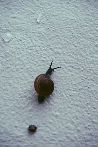 墙上的蜗牛正缓慢伸长脖子往上爬,深黑色带着白色斑点翅膀的蝴蝶正停在露珠。
