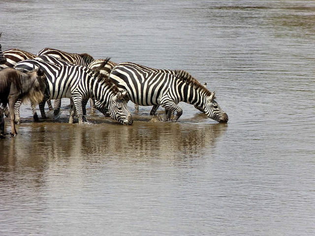 角马和斑马在河边喝水。