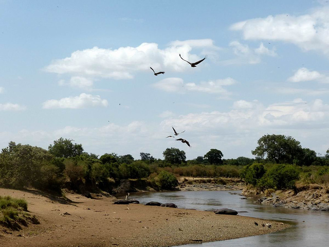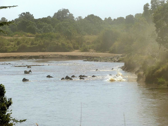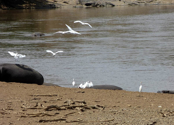 这次渡河持续了10多分钟,大概只有几百只角马渡过了马拉河。马拉河又恢复了暂时的平静,只有白鹭在飞翔。