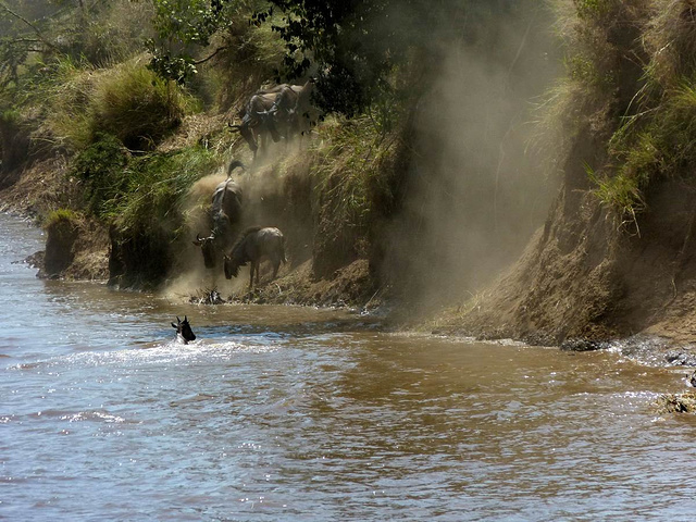 角马们跃下几米高的陡峭河岸。