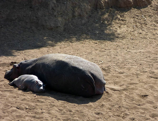 小河马依偎在母亲身旁。