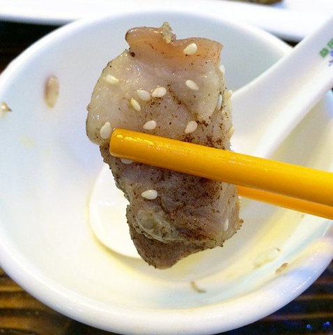 上来的时候,是一盘白白的猪肉,上面撒着一层芝麻。看着没什么特别,就像是大块大块的猪肉装盘而已,但是一口咬下去,果然是爽而不腻。猪肉不是光是瘦肉,也有一层肥肉,但是入口并没有想象的肥腻感,口感就像是五花腩,再加上有一点芝麻,所以很香很香。