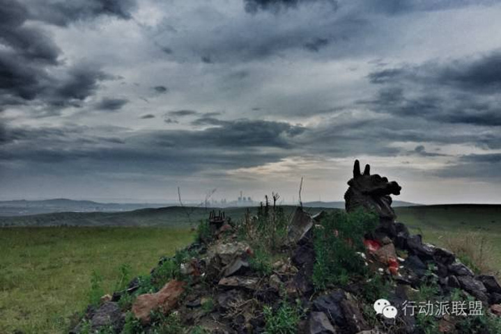 牧民的图腾和远处的城市。