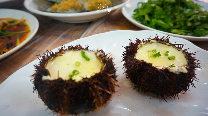两个鸡蛋蒸海胆,一定要用勺子刮海胆壁,上面满满的海胆。