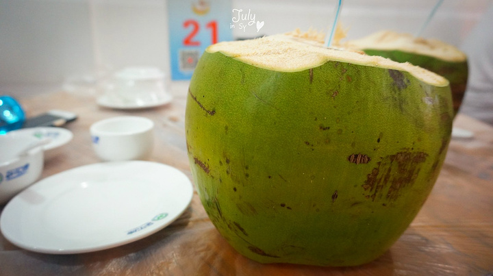 买完海鲜,让门口砍椰子的大姐帮忙挑了一个号称整框里最甜的一个。