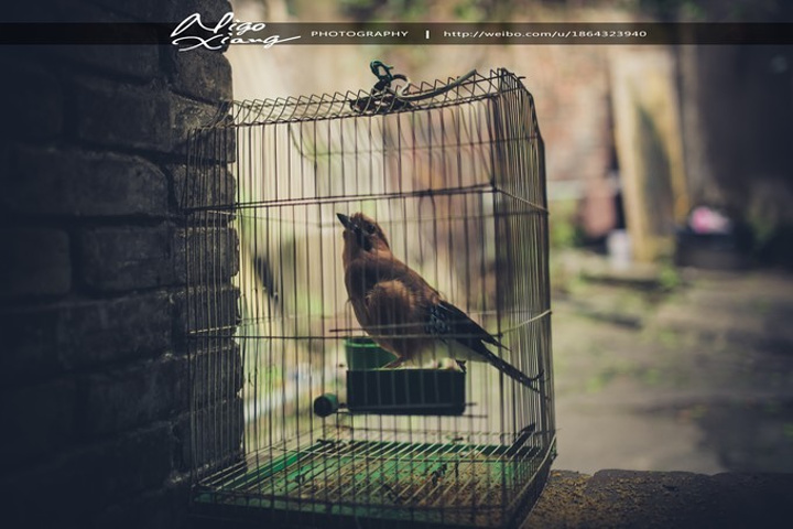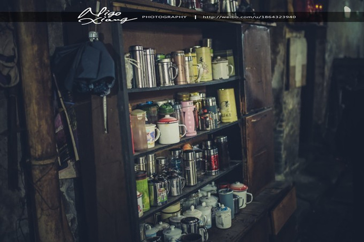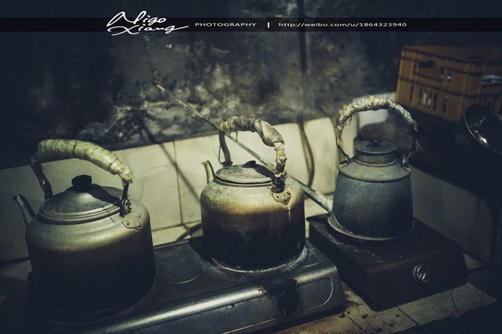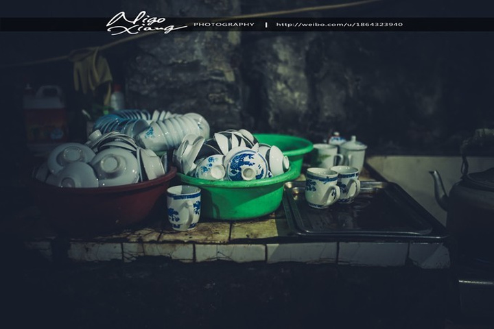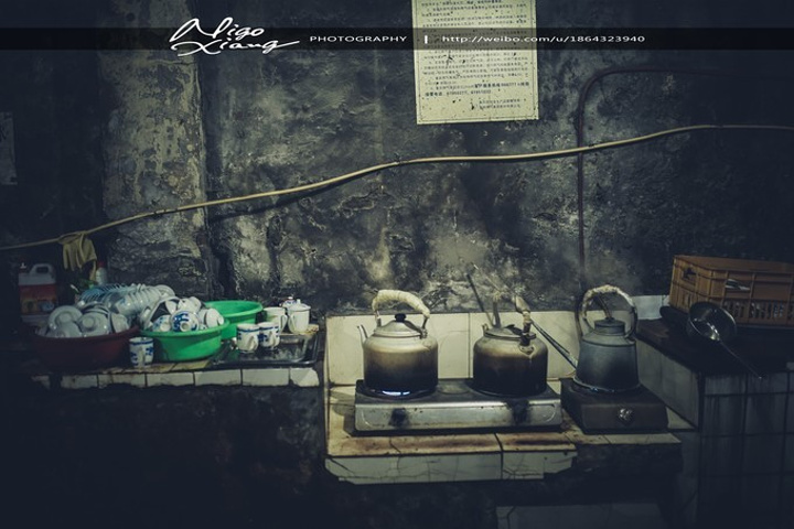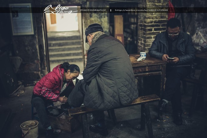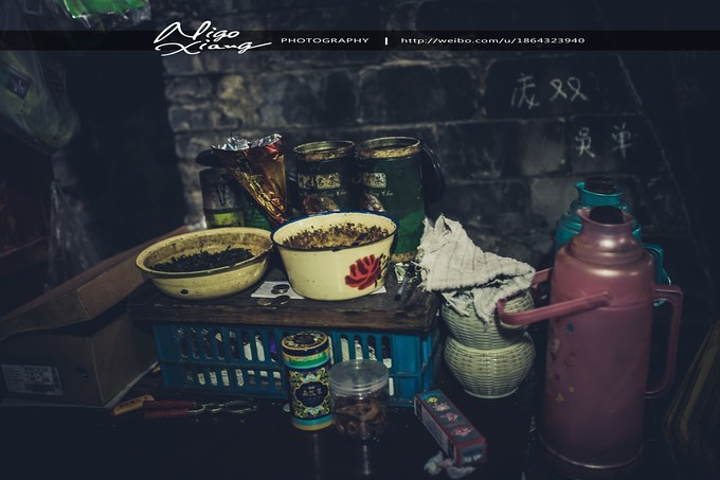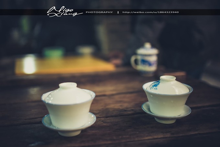 茶馆是老式的木架结构,墙体斑驳、砖瓦裸露在潮湿的空气里,光透过屋顶木梁间的空隙斜斜的打在陈旧的方形木桌、长凳和茶客身上,房顶上吊着吊扇,来到这里,感觉时光仿佛就这么凝固了。