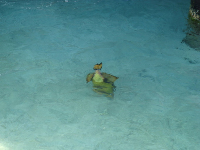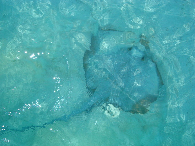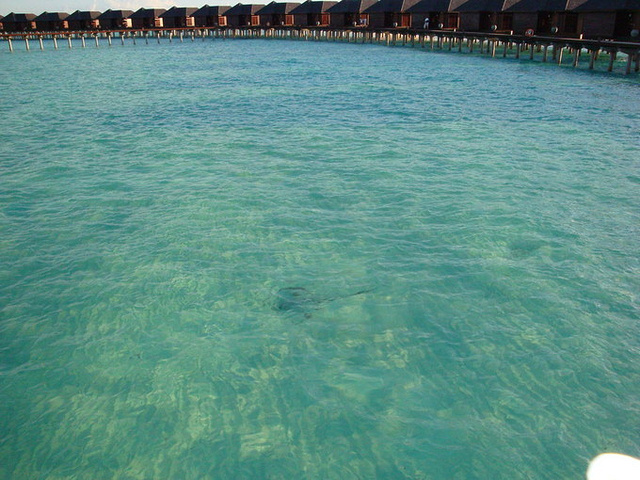 后来就经常在水上屋周围和码头栈道那边看到魔鬼鱼,据说这家伙很温顺,不大惹人咬人,不过据说某些种类是有毒的,经常在早晨和傍晚出现在岛屿附近。喜欢贴着沙地游,还会把自己埋在沙子里。