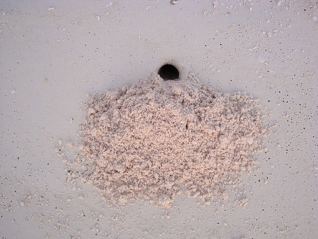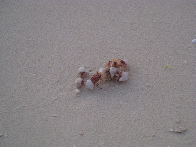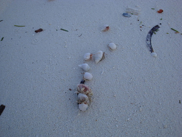在沙滩上经常可以看到很多拖着贝壳行走的寄居蟹,如果是清早还会看到他们的集体行军!清早拍摄的照片,光线有些暗淡!你会奇怪地发现沙滩上有很多非常规整的圆形竖直的洞穴,到底是谁干的呢?经过清早耐性的潜伏,终于让我找到了真凶。但是白天这些螃蟹很鬼的,从来不轻易到沙滩上来,即便在码头那里,他们也躲在安全的岩石峭壁上,瞪着两个凶狠狠的大眼睛,任凭狂风巨浪冲刷。晚上带上头灯,两个人提心吊胆地跑到沙滩上,海风呼呼地吹着,只有海浪哗啦啦的声音,夜空下的沙滩黑乎乎一片,但这确是螃蟹出来活动的时间。看看我们都发现了什么。