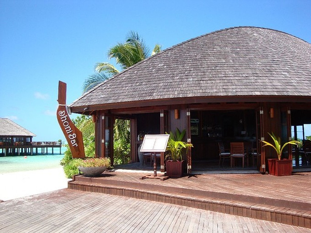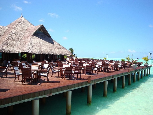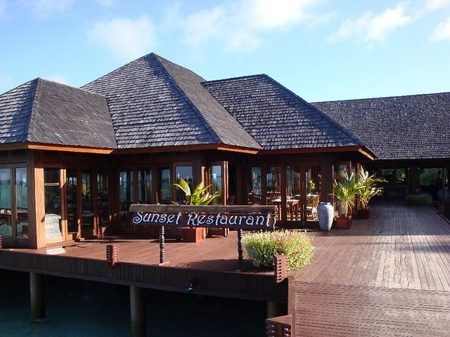 岛上共有3个餐厅,作为主要吃饭地点的Sunset餐厅,还有吃蜜月晚餐的餐厅,就在码头Sunset餐厅对面酒吧的后面。每对情侣都可以免费将一顿晚餐升级为蜜月晚餐,属于比较正规的西餐,味道还可以,但是情调绝对一流,当你坐在海边的餐桌上点着烛光吃着美味的牛排,海水在你下面轻柔地拍打沙滩,天上的月色很朦胧,银河系非常清亮地铺在夜空上,你或许会对这段话有更深刻的理解。还有个酒吧在极可意和蜜月水上房那边,主要是吃日式的饭菜,我们没有去过。酒吧有三个,比较热闹的是靠近码头这边和Sunset餐厅相对的Lagoon酒吧(名字有些记不清),每晚都有个主题,还记得周四是中国歌曲。还记得那天晚餐时听到隔壁酒吧飘来的萧亚轩的《最熟悉的陌生人》。还有个酒吧位于无边界泳池附近,另外一个在去豪华客房的路上,服务中心过去一点就是。