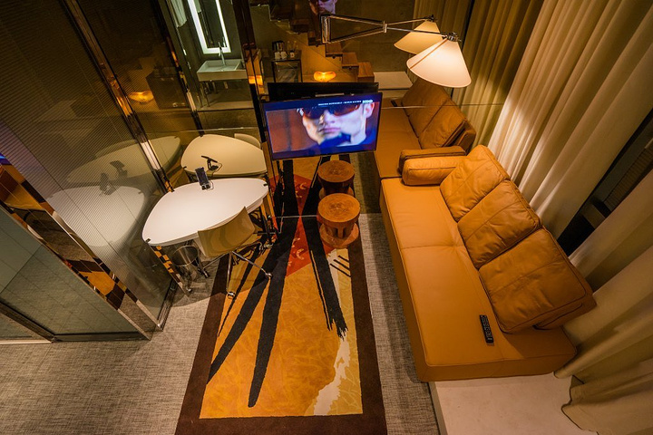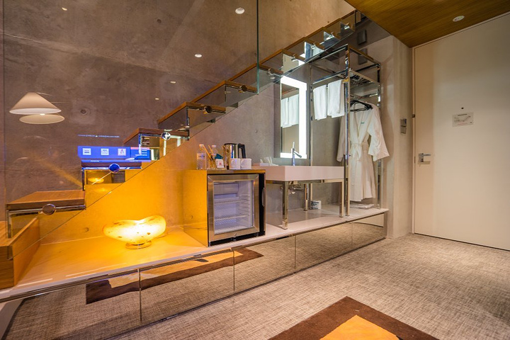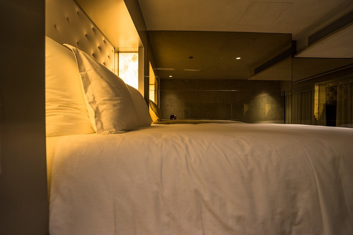 再来说说房间,面积不大,但居然是复式的结构。极高的挑高让人没有压抑的感觉。色彩布置和走廊形成鲜明对比,简洁明快的线条和大面积的金属反光都让空间更梦幻。而金属质感的墙面和扭曲的扶手,又满是工业时代的气息。复式的二层是寝区,出门在外睡眠质量是关键。专业定制的柔软寝具让一路的风尘辛苦褪去。