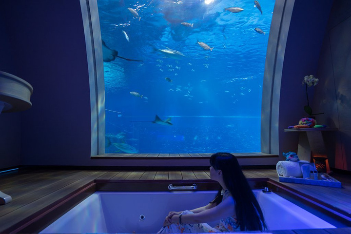 酒店在圣淘沙海洋馆的里面,窗口就对着最大的鲨鱼馆。房间的设计很有趣,就是拉下窗帘,房间中的灯才受控制。在暗暗的房间里,看着窗口的鱼游来游是一件很有趣的事情。也是在圣淘沙里必要感受的一件事情。还是楼上楼下两层的复式设计,楼下是海洋风,楼上是清新的自然风,还有一个独立的泳池。可以说是逼格满满。