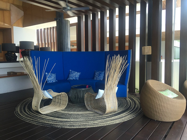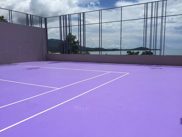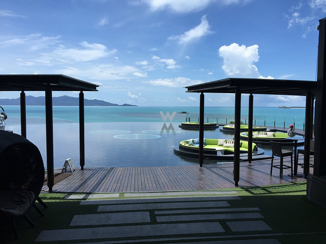 我们入住的W酒店,订好的车在机场门口接站,接站的人不会中文,而且没举牌子,虽然地方很小,但是还是很不好找,都是接人的。大概20分钟车程到达W酒店,酒店坐落在半山腰上,不是很好找,一到酒店映入眼帘的就是一孔海景,实在太漂亮了,据说W酒店的下午茶是苏梅岛上最有名的,为的都是这片海景,当然它的莲花池设计也是非常独到的,不过在里面确实挺晒的,只有问了照相的人才会坐进去,不过下午5点左右人陆续多起来。在酒店的西侧是紫色的网球场,颜色很扎眼,可能是前一天下雨的缘故,地面上有很多水。