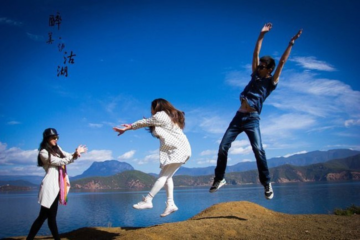 骆驼山望出去的美景,船家介绍左边的四川的泸沽湖,右边是云南的泸沽湖,站在这上面只能用“震撼”两个字来形容。大自然巧夺天工之力,在高原上创造出了这颗“明珠”。真心希望,泸沽湖不要再过度开发了,给大自然留一片净土。 乔丹跳,第二跳