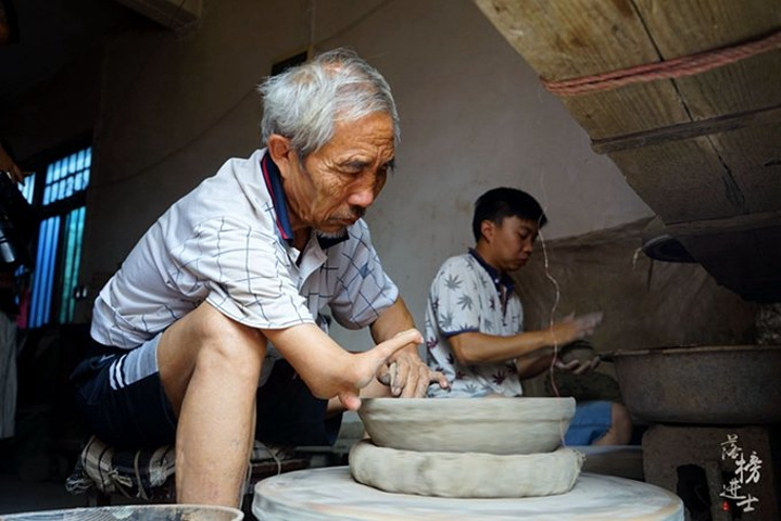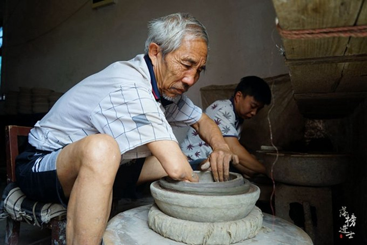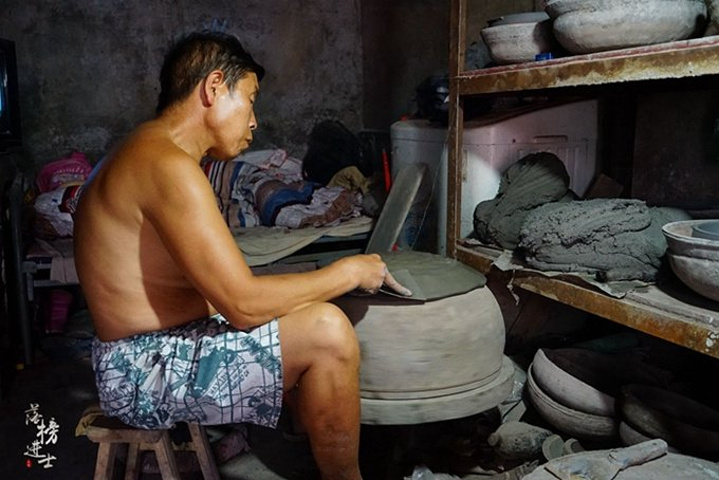 高保全是这条街知名的手艺人,他今年70多岁,10岁的时候开始学习制作砂锅,至今已经做了60多年了。当我来到他家的时候,只见他半截手臂在转动胚盘,另一只手轻压砂泥,熟练的在转轮上铺出“年轮”密布般的圆,让我们每一个人都不敢大声去打扰他,高保全老人从小就右手残疾,很难想象他是如何学习并坚持下来这一门手艺的,只见他在制做砂锅的时候,很多动作都是要靠左手来完成,制胚的时候他则换左手转动胚盘,半截手臂紧靠在砂胚上。那沾满砂泥的独臂制出来的砂锅,我们到访的每一个人不仅由衷的敬佩老人的高超技艺,更多的是一种心灵无言的震撼。
