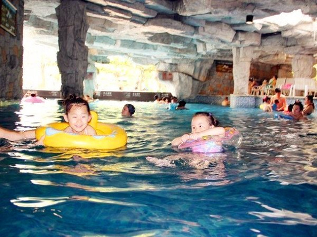 室外泳池的水还是稍微凉一些,转站到恒温泳池区,在霍大的山洞里,不用担心被晒,孩子们玩得很HAPPY。