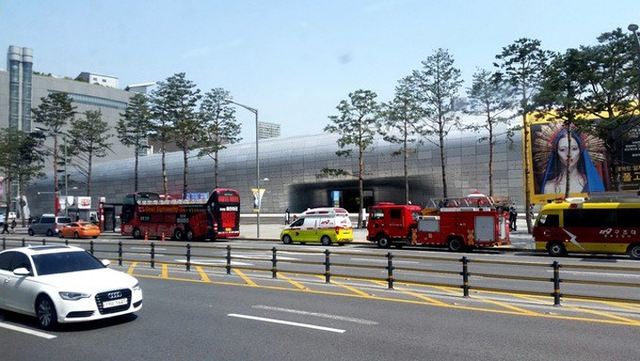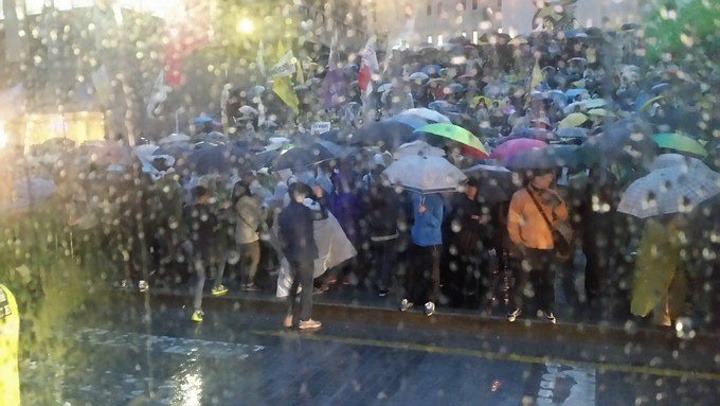 首尔繁华街道明洞附近的雨中游行聚会