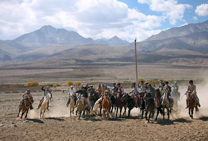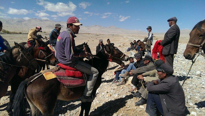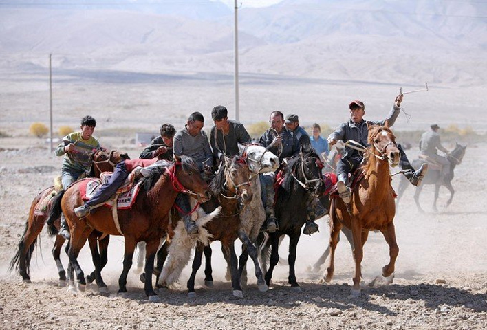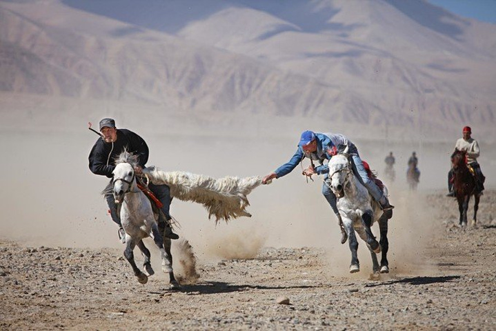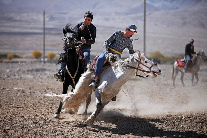 饭后,亚尔带着我去看抢羊比赛,这可是当地婚礼的重头戏之一。这里的叼羊比赛和伊犁那边的叼羊有所不同,伊犁赛马会上的叼羊赛是团队赛,比赛很规范,分两队,双方各出大约十人,各种配合,抢羊到达指定位置的一队获胜。