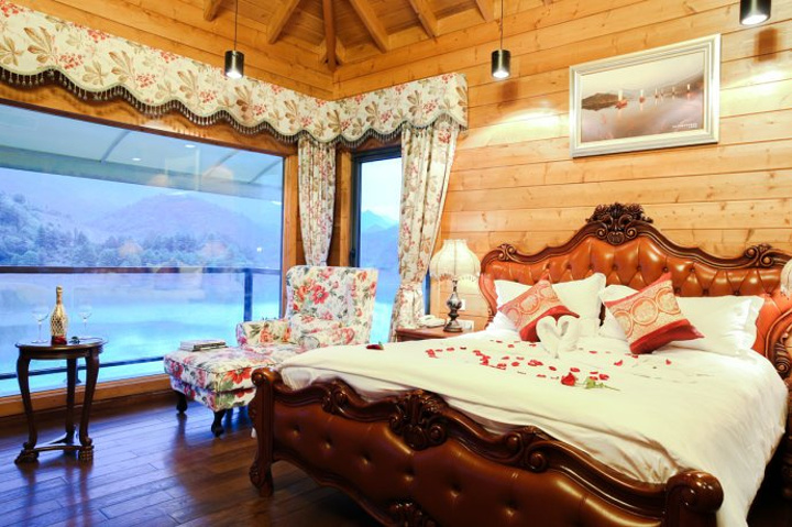 进入房间,被宽大舒适的环境所吸引,欧美格调彰显其间。房间经过精心布置,洋溢着温馨和浪漫的味道。采用原木的墙壁地板以及家具,凸显出了山野湖间的度假趣味。