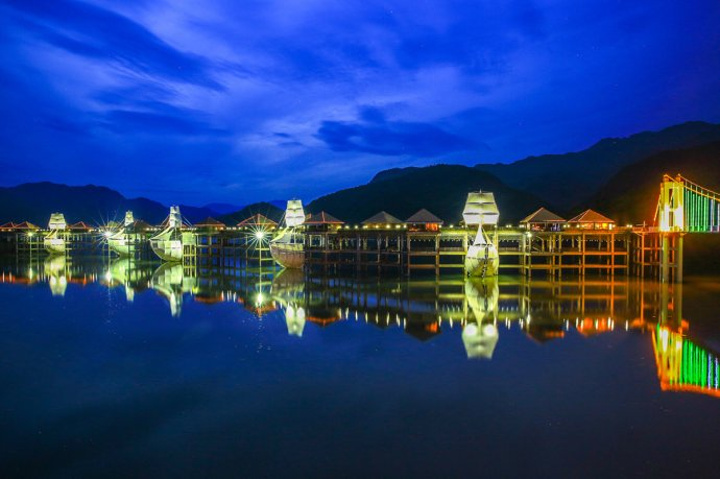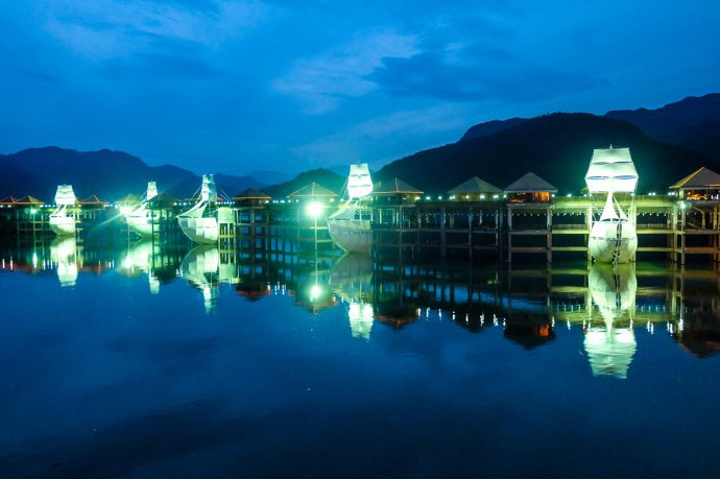 夜晚的云和酒店,青山怀抱中,湖水静谧无声,远处17栋木屋居于水中央,白色的帆船清晰可见。远山的轮廓越发清晰,连云和湖中都有了倒影,漂亮极了。